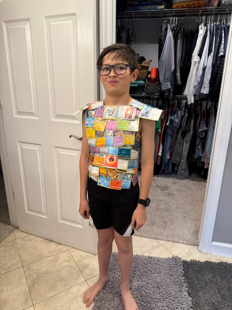 [You can see one of my biggest responsibilities to the right. My need to create has rubbed off on my son. He had a grouping of Pokémon cards he didn’t think were “rare,” so he made a shirt of them.]